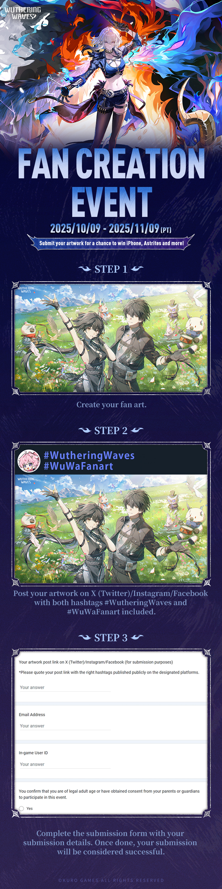 - Work Types: Both 2D/3D artwork and short-form video are accepted. Content must reference Wuthering Waves characters, moments, or themes from v2.7 “Dawn Breaks on Dark Tides.”